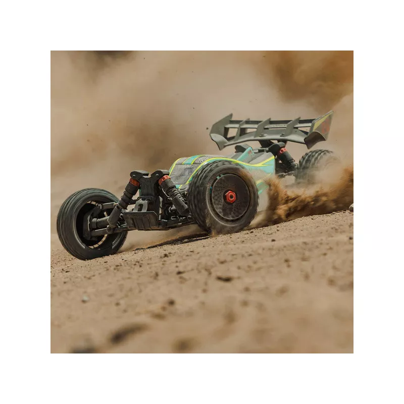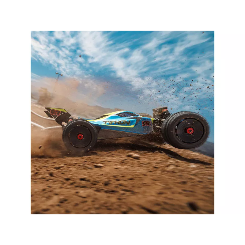 Arrma Typhon 223S BLX RC-Car-Modell im Buggy-Stil mit Allradantrieb, Einzelradaufhängung, Ölstoßdämpfern und leistungsstarkem AC-Antrieb erreicht eine Geschwindigkeit von bis zu 80 km/h. Und das alles zu einem erschwinglichen Preis für ein so leistungsstarkes Modell. Für hervorragende Fahreigenschaften sorgt der Allradantrieb mit Mitten- und Achsdifferenzial. Die exklusive DSC-Fahrstabilisierung ist im Lieferumfang enthalten. Das RC-Auto ist für Kinder, Erwachsene, Anfänger und erfahrene Fahrer gedacht, die ein fertiges, langlebiges und schnelles Modell erhalten. All dies ist in einem schön verarbeiteten Gehäuse mit verstecktem Klick-Montagesystem untergebracht.