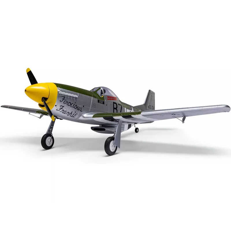 Die Konstruktion des Modells besteht aus strapazierfähigem EPO-Material. Ein solides Fahrwerk mit lenkbarem Hinterrad erleichtert das Rollen, Starten und Landen auf glatten Oberflächen. Oder Sie bauen das Fahrwerk ab, starten per Handwurf und landen bäuchlings im Gras. Obwohl das Modell über kompakte Abmessungen für den einfachen Transport im Auto oder zur Lagerung verfügt, ist es auch mit Flügeln mit berührungslosem Anschluss der Servos ausgestattet, was eine schnelle Demontage und Montage ermöglicht. Leistungsstarkes Antriebssystem mit AC-Motor und 30A-Controller mit Telemetrieunterstützung, kann mit gängigen 3S-4S LiPo 1300-2200 mAh Akkus betrieben werden. Die Quer-, Höhen- und Seitenruder sind mit insgesamt vier Spektrum-Digitalservos mit Metallgetriebe ausgestattet und sorgen so für eine präzise und zuverlässige Steuerung. Die Lackierung ist werkseitig mit der „Ferocious Frankie“-Tarnung versehen , die auf der Mustang verwendet wurde, die von Major Wallace E. Hopkins gesteuert wurde – dem Jagdflieger, der im Zweiten Weltkrieg acht Siege errang.