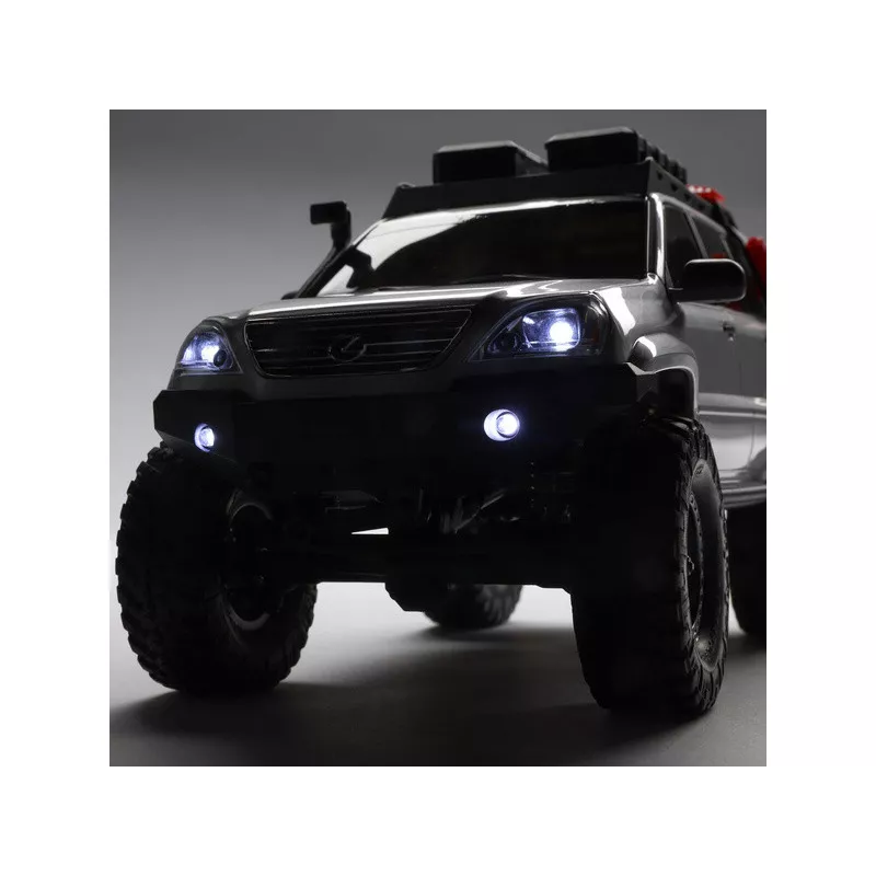 Das Modell ist für den Fahrbetrieb mit Stahl-C-Träger-Chassis, Mehrlenkeraufhängung mit Stahlstangen, geraden Vollachsen und Ölstoßdämpfern ausgestattet. Der permanente Allradantrieb treibt einen Gleichstrommotor über ein Getriebe, Mittelwellen und Schneckenräder in Verteilergetrieben an. Die lizenzierte Lexus-Karosserie aus strapazierfähigem ABS-Material wird durch viele Details wie einen Dachträger mit Zubehör, einen Schnorchel und nicht zuletzt eine LED-Frontbeleuchtung für tolle Abendfahrten ergänzt. Lizenziert sind auch Black Rhino Raid-Räder mit bewährten Nitto Trail Grappler M/T Offroad-Reifen.
