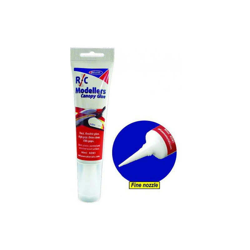Deluxe Materials RC Modeller ist ein Mehrzweckklebstoff, der speziell für das Verkleben von durchsichtigen Kunststoffen entwickelt wurde - z. B. für die Modellierung von Kabinen. Der Klebstoff klebt auch Kunststoffe, Holz, Folien und lackierte Oberflächen. Der Leim ist dick und lässt sich leicht auf die Oberfläche auftragen, von der er nicht läuft. Nach dem Aushärten ist die Verbindung klar, flexibel und wasserabweisend. Der Klebstoff kann mit üblichen Farben gefärbt werden. Die Trocknungszeit beträgt je nach Schichtdicke 30 bis 60 Minuten. Der trockene Klebstoff kann mit Wasser gewaschen werden.