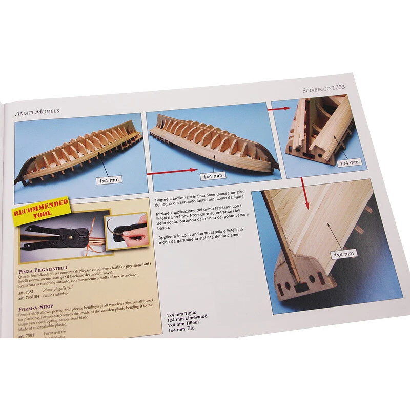 Statisches Modell des historischen Schiffes AMATI Sciabecco Piratenschiff aus dem Jahr 1753, Maßstab 1:60, Bausatz. Das Piratenschiff war mit 14 Kanonen mittleren Kalibers bewaffnet. Holzteile wie ein Kiel und eine Planke sind lasergeschnitten, darunter Segel, Seile, Masten, Beschläge, Zubehör und Pläne.