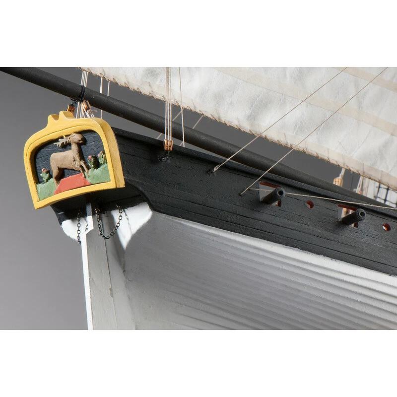 Das Paket des Modellbausatzes enthält einen Satz lasergeschnittener Sperrholzplatten und kompletter Holzkomponenten, Messingkomponenten, Bretter und Streifen für das Deck, vorgedruckte Flaggen, Stoff für das Segel und genügend Takelage für das gesamte Schiff. Montage hilft detaillierten Bauplan und präzisen Anweisungen, Handbuch Deutsch und EN.