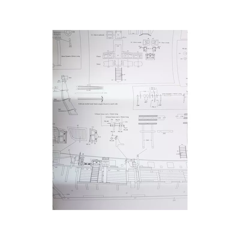 Das Paket enthält lasergeschnittene und gravierte Teile aus MDF und Birnbaumholz, Linden- und Birnbaumholzleisten (zweite Haut), lasergeschnittenes und graviertes Deck, 3 Messingplatten mit fotogeätzten Teilen, Masten, Rollen, Ösen und Seile für die Takelage, Holz- und 3D-gedruckte Komponenten. Ausführliche, farbige Gebrauchsanleitung mit 16 maßstabsgetreuen Modellzeichnungen und Details im DIN A1-Format – EN-Handbuch.