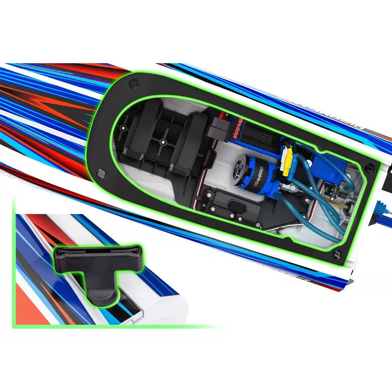 Das Modell und seine Komponenten sind so konzipiert, dass das Risiko des Eindringens von Wasser in die Elektronik minimiert wird, beispielsweise durch die Dichtungsringe am Servo, den epoxidierten Regler oder den Empfänger, der in einem patentierten Gehäuse mit Schaumstofftülle untergebracht ist.