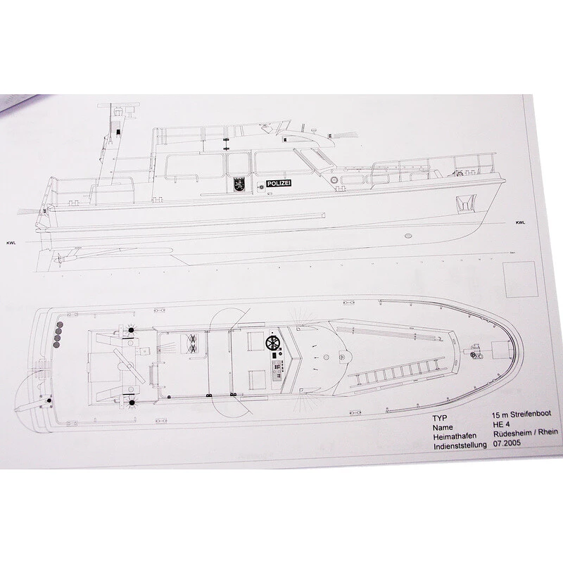 Klassischer Bausatz des Polizeibootes HE-4 als RC-Modell eines ferngesteuerten Schiffs. Halbmodell im Maßstab 1:20, Länge 760 mm, Breite 195 mm, Laminatrumpf, Gewicht ca. 1700 g.