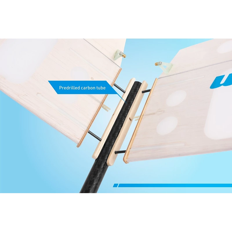 Der dreiteilige Flügel mit speziellem HB-RES-Profil ist eine klassische Konstruktion mit Balsa-Rippen und einer steifen Torsionskastenabdeckung auf der Mittelebene. Der Hauptträger besteht aus Flanschen aus Fichtenlatten mit Balsa-Steg, was eine hohe Festigkeit des Skeletts bei sehr geringem Gewicht garantiert. Die Ohren mit eleganten Winglets sind durch Carbonverbinder und Buchenstifte mit Magneten als Sicherungen mit der Mittelebene verbunden. In der Mittelebene befindet sich eine zweiteilige kippbare aerodynamische Bremse - wir empfehlen, diese nicht zu verpassen, insbesondere wenn Sie einen "sauberen" Schirm bauen. Gesteuert wird es von einem einzelnen Servo mittels Torsionsantrieb aus einer Carbonstange mit Laminathebeln. Der Flügel wird mit einer Kunststoffschraube am Rumpf befestigt.