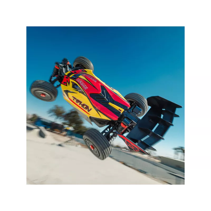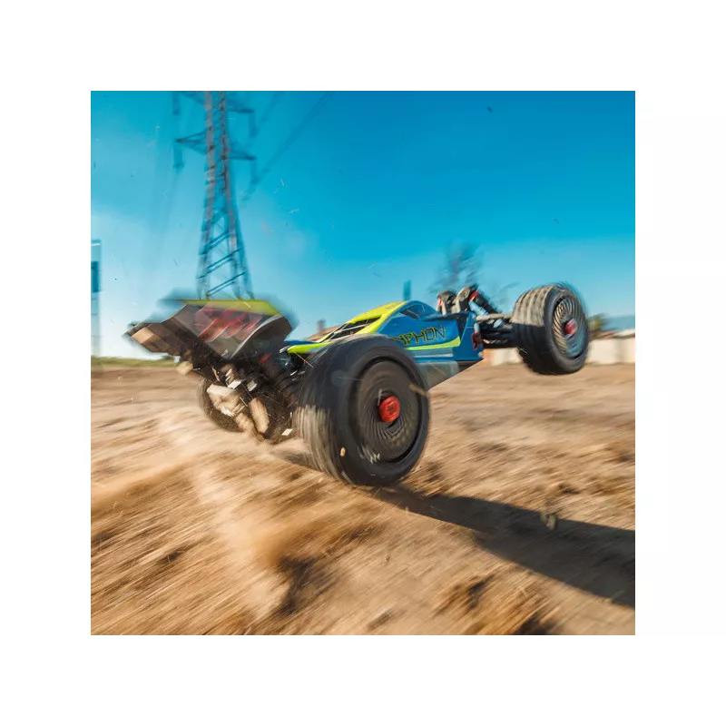 RC model buggy Arrma Typhon Mega v měřítku 1:8 s pohonem 4x4, ideální pro děti a začátečníky, který nabízí extra výkon ihned po vybalení, díky o 11% většímu stejnosměrnému motoru 665 (High Speed). Dosahuje rychlosti až 32 km/h. Odolné šasi s kluznými deskami a zvýšenými bočnicemi proti vnikání nečistot. Robustní diferenciály s kovovými převody. Olejové tlumiče. Bezsponková karoserie pro snadnou výměnu akumulátoru. RC souprava Spektrum SLT2.