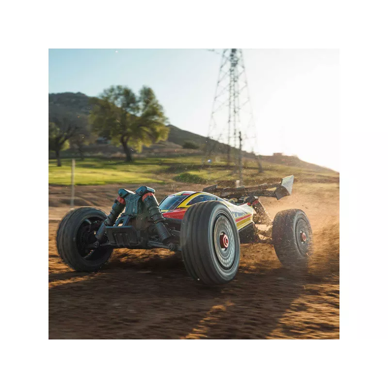 Není lepší způsob jak začít vaše off-roadové jízdy, než s touto působivou větší buginou za dostupnou cenu, kterou lze navíc později snadno upgradovat na střídavý pohon, díky převodovce připravené na výkon 3S LiPo a diferenciálům s kovovými planetovými převody. Pro zvládnutí zvýšeného výkonu je místo klasické kluzné spojky instalována speciální spojka proti přetížení. Terénní zavěšení kol a olejem plněné tlumiče výborně absorbují nerovnosti. Můžete upravit světlou výšku pomocí podložek pod pružiny pro skoky a jízdu v hrubé terénu. V terénu i na asfaltu poskytují pneumatiky dBoots 2-HO úžasnou trakci.