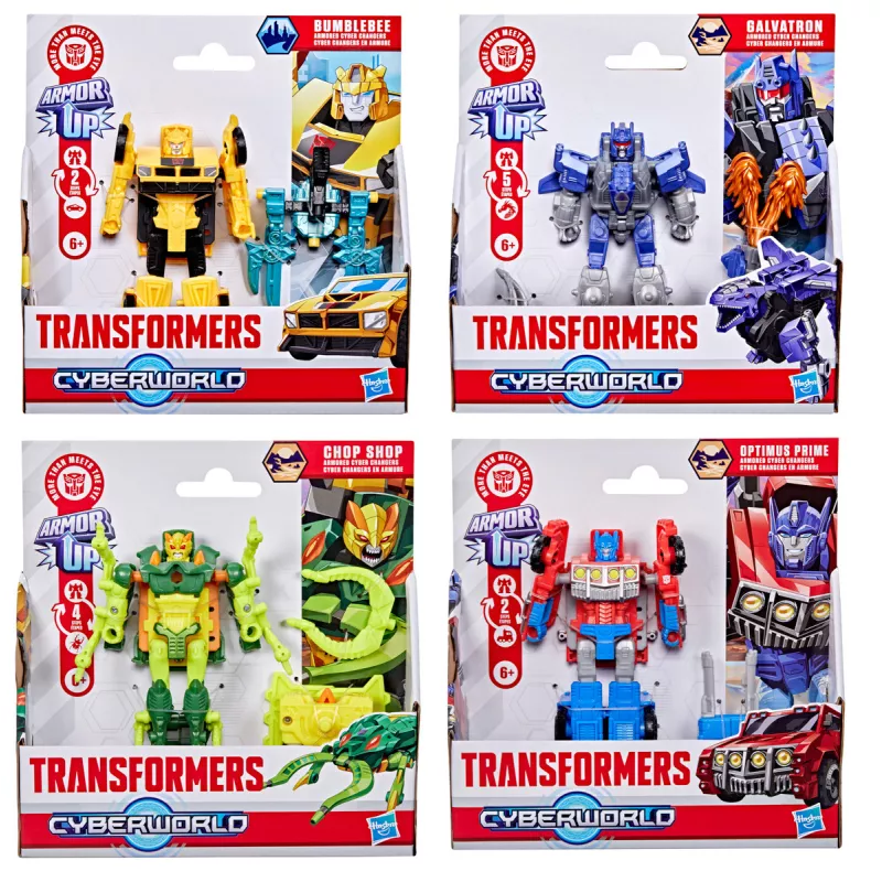 Transformers Cyberworld Armored Cyber Changers vám přináší známé tváře a nové bojové strategie! Posilte se svými oblíbenými Autoboty a Decepticony, zatímco bojují o galaktickou nadvládu. Tyto 10 cm vysoké figurky se snadno promění z robota na alternativní mód vozidla ve 2 krocích. Každá figurka obsahuje doplněk v podobě blasteru. Figurky v kolekci: Optimus Prime, Bumblebee, Galvartron a Chop Shop. Assort je náhodný mix modelů. Výběr nelze ovlivnit. Vyrobeno z kvalitního plastu. Rozměry balení: 18,09 x 17,7 x 4,9 cm. Věk: 6+