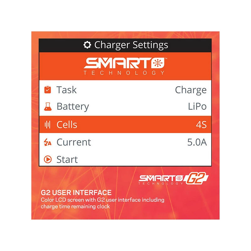 Aby bylo nabíjení co nejpohodlnější, má nabíječ Spektrum™ S155 Smart G2 AC barevný LCD displej s vylepšenými nabídkami, ikonami a navigačními nástroji. Jeho intuitivní rozhraní umožňuje uživatelům sledovat průběh nabíjení a snadno provádět změny nastavení. Hodiny na obrazovce odpočítávají minuty v reálném čase, dokud není vaše baterie Smart plně nabita a připravena k použití.