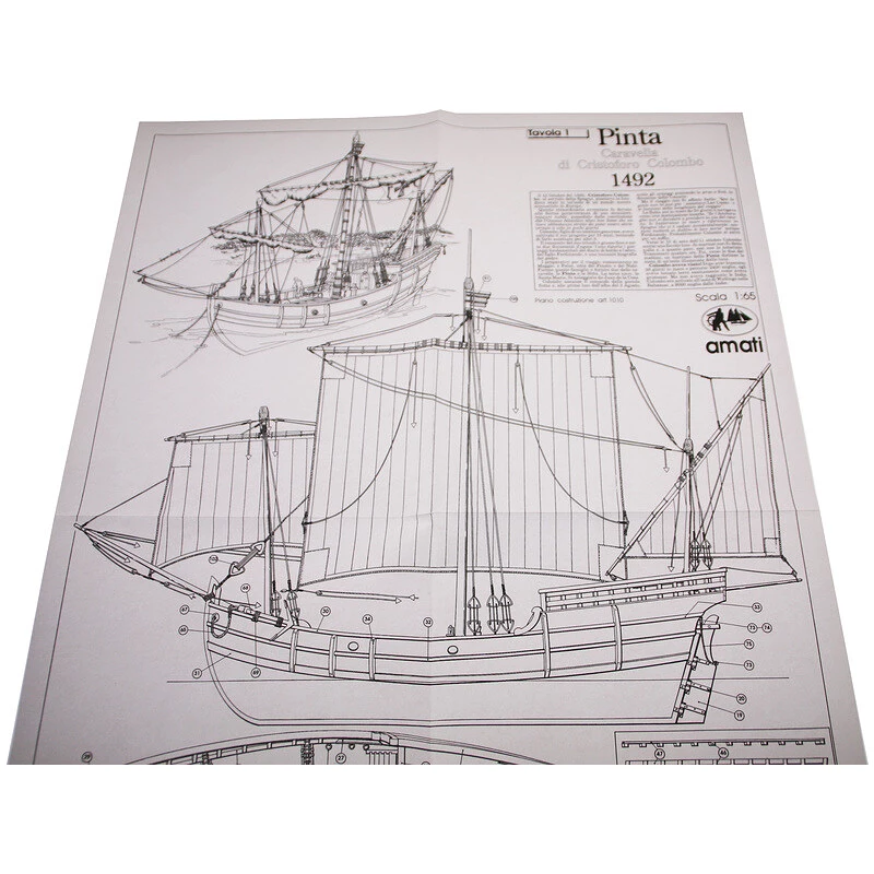 Stavebnice statické makety lodi, AMATI Pinta karavela z roku 1492 v měřítku 1:65 kit. Jedna ze tří lodí, s nimiž Kryštof Kolumbus objevil Ameriku. Tento model je součástí série Columbus společnosti AMATI. Dřevěné díly jako kýl a obšívka jsou řezány laserem, obsahuje plachty, lanoví, stožáry, kování a plány.