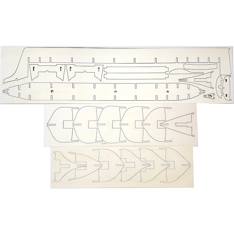 Po otevření víka krabice naleznete dřevěné díly modelu z překližky, lišty, drobné součásti v plastových sáčcích a manuál.