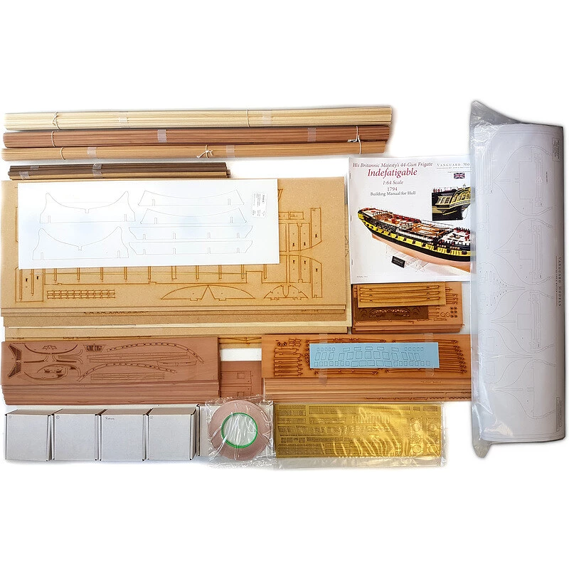 Stavebnice neplovoucí makety lodi od anguard Models, HMS Indefatigable z roku 1794, v měřítku 1:64. Pro zkušené modeláře. Dřevěný trup z laserem vyřezaných dílů, součástí je stavební plán, autentické detaily. Komplexní, barevný návod k použití