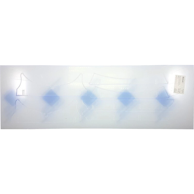 - Laserem řezané kusy z MDF a čirého acetátu pro okna galerie. Všechny viditelné části jsou vyřezány laserem z desek z hruškového dřeva