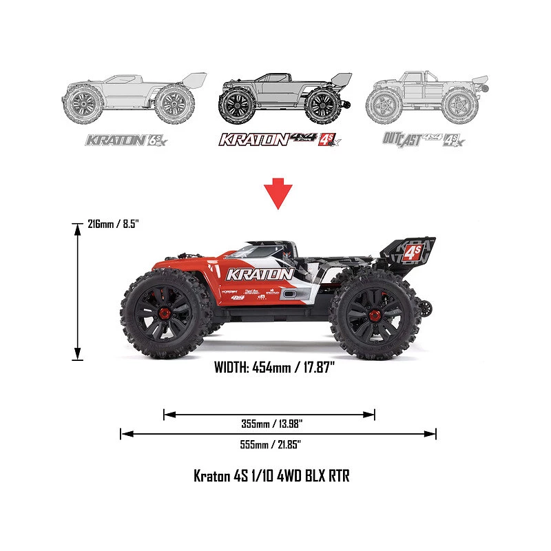 Zmíněné vylepšení se kombinují s osvědčenými vlastnostmi ARRMA 4S BLX jako jsou – hliníkové olejové tlumiče s dlouhým chodem, široké robustní ramena, až po kovové diferenciály a ocelové přední a zadní hnací hřídele EXtreme Bash CVD pro nezastavitelný přísun výkonu. Šasi modelu rovněž obsahuje populární snadno přístupnou modulární konstrukci ARRMA, aby byla běžná údržba rychlá a jednoduchá.
