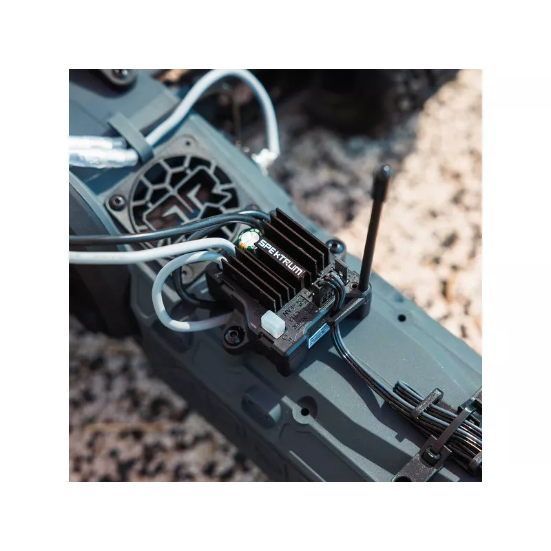 Vysílač Spektrum SLT poskytuje bezpečný provoz bez výpadků a pro začátečníky umožňuje možnost omezení výkonu na 75%, nebo 50%. Pro bezstarostnou jízdu jsou na modelu použity voděodolné* komponenty - regulátor s přijímače Spektrum 2-v-1 40A a servo řízení Spektrum S660 s vysokým točivým momentem.