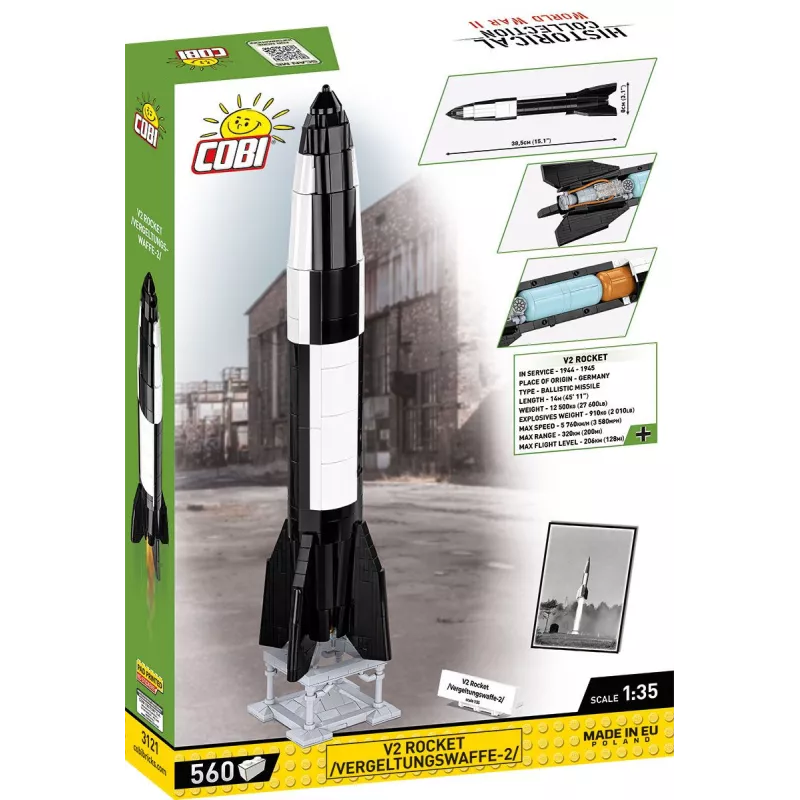 Raketa V2 je jednou z nejznámějších tzv. zázračných zbraní „Wunderwaffe“, které měly zvrátit průběh války. Tato konstrukce dodnes fascinuje mnoho nadšenců do historie a 2. světové války. Na přání fanoušků přinášíme legendární raketu V2 v měřítku 1:35. Samotná raketa má odnímatelný kryt, pod kterým se nachází reprodukovaný interiér: výkonný raketový motor, palivová nádrž a hlavice s výbušninou!