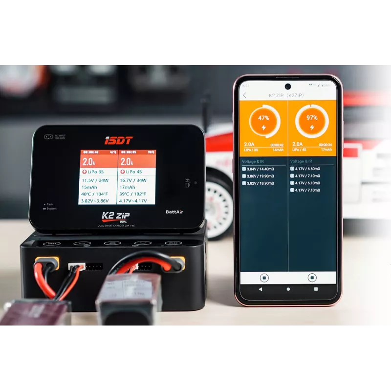 Das Hochleistungs-Zweikanal-Ladegerät ISDT K2 ZIP 2x500W ist ein intelligentes Ladegerät mit Stromversorgung aus Netz und Autobatterie und sehr einfacher und übersichtlicher Bedienung. Mit K2 ZIP können Sie gängige Zelltypen (NiCd, NiMH, LiPo, LiHV, ULiHV, Li-Ion, LiFe, Pb) laden und entladen. Darüber hinaus ist es mit integrierten Achtkanal-Balancern ausgestattet, die ein sicheres Laden gewährleisten von Lithiumbatterien. Das Ladegerät ist mit einem Farb-LCD-Display und Programmiertasten ausgestattet, die Ihnen die Möglichkeit einer komfortablen und sehr übersichtlichen Parametereinstellung, Steuerung und Überwachung des Lade-/Entladevorgangs bieten.