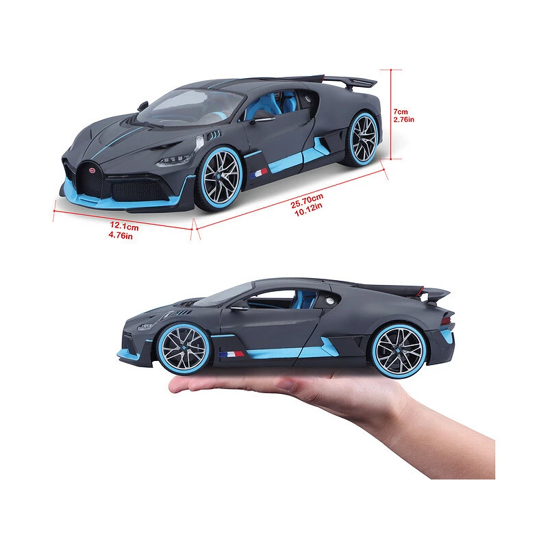 Metallmodellauto 1:18 Bburago 18-11045 Bugatti Divo nicht nur für Sammler. Es hat eine zu öffnende Tür und Motorhaube, Lenkräder. Die Farbe des Modells ist Silber.