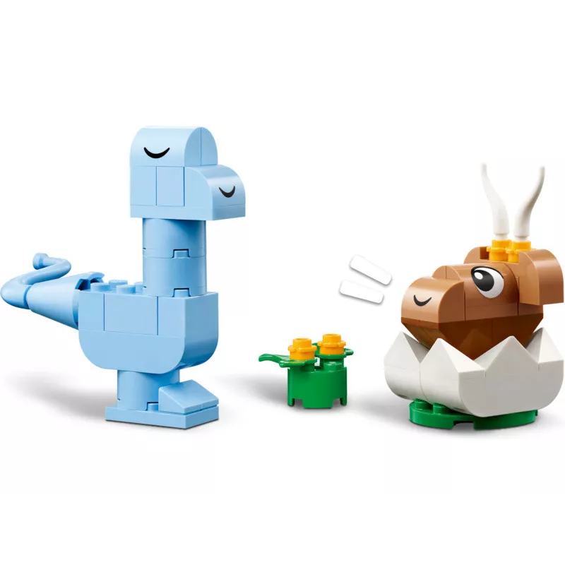 Dieses Set ist vollgepackt mit schnell zu bauenden LEGO-Dinosauriermodellen und enthält einen T-Rex, einen Flugsaurier, einen Triceratops, einen Brontosaurus und ein Baby-T-Rex in einem Ei. Das Set enthält außerdem einen Vulkan, eine Palme und Zubehör, das Kinder zum Spielen anregt. Zusätzlich zu den bunten Blöcken enthält der Bausatz auch spezielle Teile, darunter Augen und Münder, die den Dinosauriergesichtern unterschiedliche Gesichtsausdrücke verleihen. Der kreative Spaß geht weiter, wenn die Kinder die Blöcke mischen und die Modelle neu anordnen. Wenn Kinder mehr Selbstvertrauen beim Bauen gewinnen, können sie mithilfe intuitiver Bauanleitungen ihre eigenen fantasievollen Dinosaurier erschaffen.