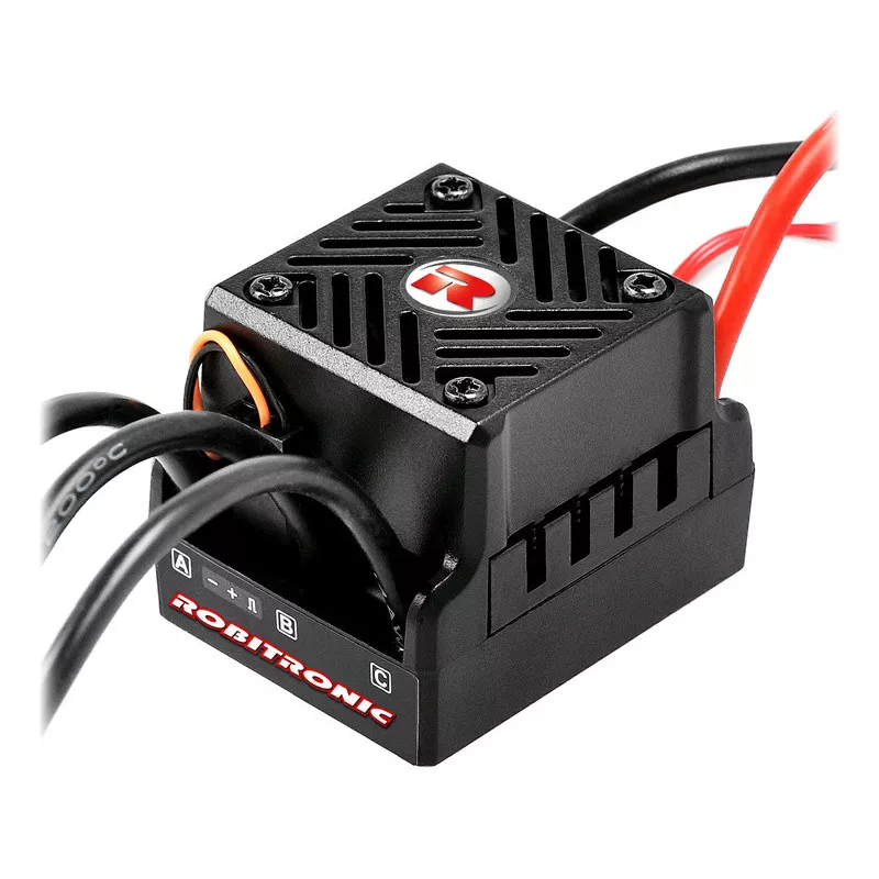 Robitronic Razer G2 60A elektronischer AC-Controller für Onroad- und Offroad-RC-Autos im Maßstab 1:10. Angetrieben durch einen 2-3S LiPo- oder 6-9 NiMH-Akku. Wasserdichtes* Design. Integrierter Kühler mit Lüfter. Vielfältige Einstellmöglichkeiten mit der SET-Taste oder über die Programmierkarte.