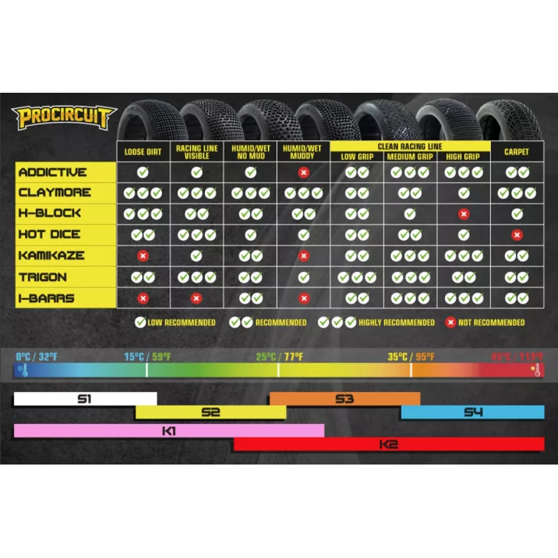 Diese neue S-Mischung ist hochtemperaturstabil und funktioniert daher unabhängig von der Umgebungstemperatur. Dadurch kann die Mischungswahl ausschließlich auf dem aktuellen Streckengrip basieren, was die Bestimmung der passenden Härte deutlich vereinfacht.