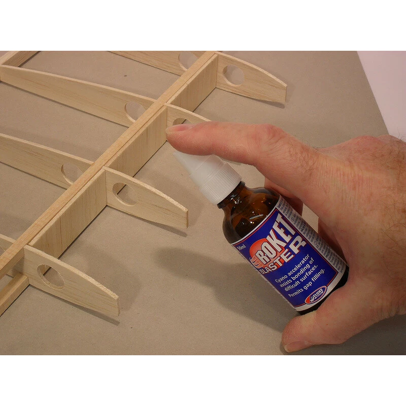 Roket Blaster ist ein Katalysator, der durch Erhöhung des pH-Werts eine schnelle Polymerisation von Sekundenklebstoffen auch in dicken Schichten auf nicht saugenden Oberflächen ermöglicht. Der Aktivator wird in einem Behälter geliefert, der mit einem Sprühgerät versehen ist. Dank einer speziellen Formel greift es selbst klare Kunststoffe nicht an!