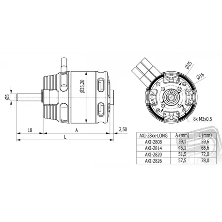 Die neue Generation von AXI 2820 / xx V2 hat eine höhere Performance dank seiner ausgefeilten Design, das in Verbindung mit einem integrierten System Kühlung basiert auf dem Prinzip eines Turbineneffekt Luftstrom durch die Motorwicklungen Kühler hält bis zu 20%. Eine spezielle Version von "Long" hat eine verlängerte verjüngte Vorderkante für den einfachen Einbau in Rümpfe Segelflugzeug mit einem kleinen Durchmesser Stiel.