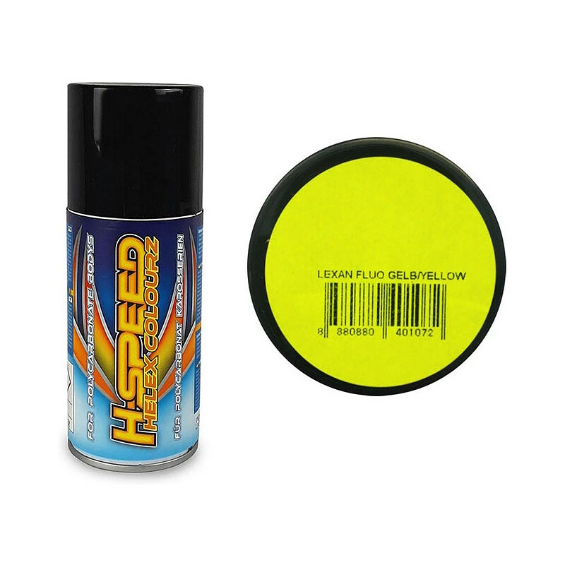 Die gelbe fluoreszierende Acryl-Sprühfarbe von H-Speed eignet sich für eine Vielzahl von Materialien, einschließlich Lexan-Karosserien. Der Vorteil liegt in einer kurzen Trocknungszeit, einer hervorragenden Deckkraft und Kratzfestigkeit. Inhalt 150 ml.