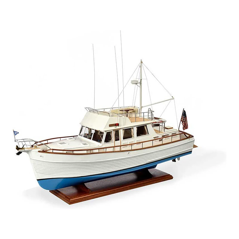 Statischer Schiffsmodellbausatz, AMATI Grand Banks Motoryacht von 1967 im Maßstab 1:20, Bausatz. Ein exaktes Modell der klassischen Grand Banks-Motoryacht. Das Paket umfasst einen Laminatrumpf, lasergeschnittene Holzteile für Decks und Aufbauten sowie Messing- und Metallteile. Das Modell kann mit einem KR-25037-Antrieb und einer Fernbedienung ausgestattet werden.