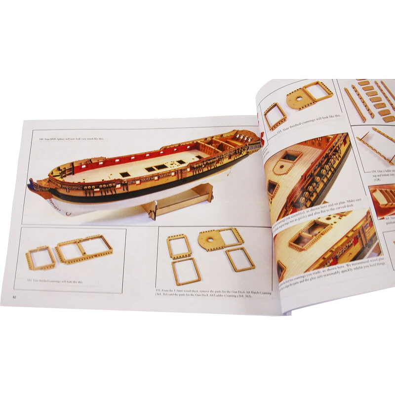 Das Paket umfasst lasergeschnittene Holzteile, Planken, Decks, Masten, 3D-gedruckte Teile, Dekorationen, Messingbeschläge, Gewinde und Mock-up-Teile. Ausführliche bebilderte Anleitung mit EN-englischer Beschreibung und Bauplänen.