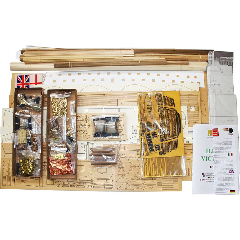 Das Paket enthält einen Satz Sperrholzteile, einen Satz Holzlatten mit verschiedenen Querschnitten, einen Blister mit Kleinteilen, Messingteile, einen Satz Zeichnungen und ein mehrsprachiges Handbuch.