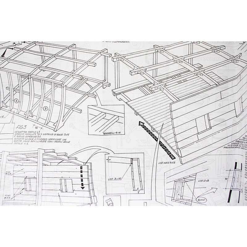 Das Set enthält eine vollständige Zeichnungsdokumentation des Modells im Maßstab 1:1 mit Abbildungen einzelner Details. Die Zeichnung zeigt maßstabsgetreu die Montagebaugruppen, deren Fertigstellung, einschließlich Masten und Auslegern sowie die Art der Anbindung der Takelage. Der mehrsprachige Konstruktionsprozess bietet einen Rahmen für den logischen Zusammenbau einzelner Komponenten.