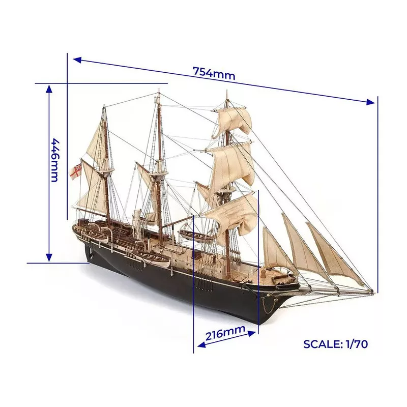 Bausatz eines nicht schwimmenden Modells der OCCRE HMS Endurance im Maßstab 1:70. Das Paket enthält alle Teile für den Bau sowie Segel – lasergeschnittene Teile, Leisten, Fotoaufkleber aus Messing, Takelage und mehr. Bauzeichnungen und Anleitung sind ebenfalls enthalten.