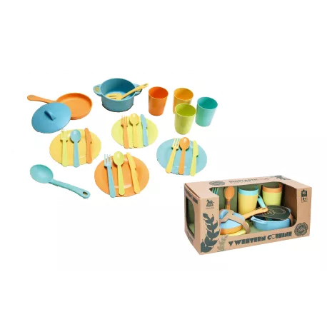 Küchenutensilien aus Biokunststoff. Pfanne mit Deckel, Topf, 4 Teller, 4 Gläser, 2 Schöpfkellen, 4 Messer, 4 Gabeln, 4 Löffel.