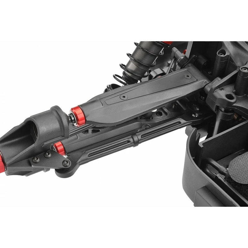 Das Design des Kagama wird von drei wichtigen Komponenten dominiert: präzise konstruierten Querlenkern, innovativen Fahrwerksstreben und langlebigen, präzisen Dämpfern. Die Querlenker wurden komplett neu gestaltet und legen Wert auf Haltbarkeit und Präzision ohne zusätzliches Gewicht. Ergänzt wird dies durch Scharnierstifte aus eloxiertem Aluminium und drehbare Kugelhalterungen, die für unübertroffene Festigkeit sorgen und wichtige Aufhängungselemente gegen die Anforderungen extremer Abbrucharbeiten verstärken. Der Kagama zeichnet sich durch ein neues 4x4-Fahrwerksverstärkungssystem aus, das sowohl die Haltbarkeit als auch die Leistung erhöht, indem es die Trennwände vor Stößen und Erschütterungen schützt. Darüber hinaus ist das Fahrzeug mit robusten 16 mm großen Stoßdämpfern mit Aluminiumgewindekörpern und harten Federn ausgestattet, die die für ausgiebiges Bashing erforderliche Zuverlässigkeit und Kontrollierbarkeit garantieren. Mithilfe starker, abgestimmter 4-mm-Kolben können diese Stoßdämpfer mit dickeren Flüssigkeiten umgehen, die zur angemessenen Dämpfung von unebenem Gelände oder Hindernissen erforderlich sind, während übergroße untere Enden der Stoßdämpfer die Gesamthaltbarkeit erhöhen. Erleben Sie die nahtlose Integration dieser Elemente in Aktion, die selbst unter anspruchsvollsten Bedingungen kontrollierte Präzision gewährleistet.