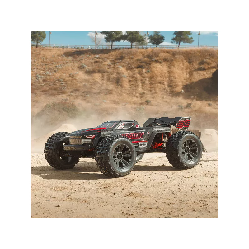 The Kraton 6S RC car model offers even more value, thanks to a 7075 T6 aluminum chassis, upgraded 7075 T6 aluminum oil-filled shock absorbers, undercarriage braces, EXB parts, and oversized wheel hubs with double inner bearings and rubber caps. All of this, along with all-metal differentials, transmission, and steel driveshafts, provides precise, sharp handling that can withstand rough handling.