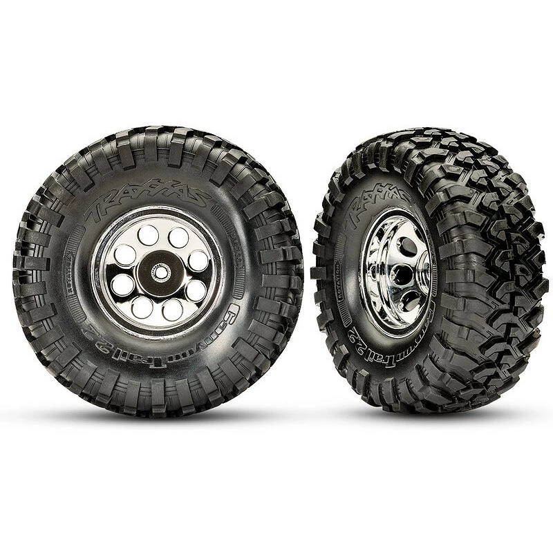 Large Canyon Trail tires in extra soft S1 compound are glued to replica original chrome 2.2" wheels with eight holes and center hub cap. Wheel carrier is 12mm.