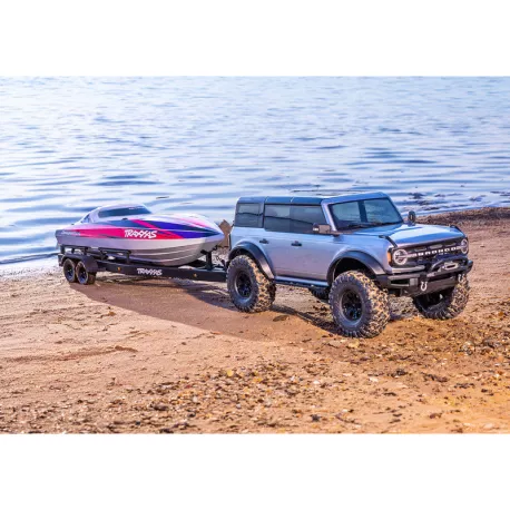 Transport your Traxxas Disruptor boat to the water in style with the detailed dual-axle trailer. Elastic tie-downs securely fasten the boat to the lightweight aluminum frame along the entire length of the trailer. Using the included height-adjustable towing device, you can tow the trailer behind the Traxxas TRX-4 / TRX-6* (incl. High Trail) and Ford Raptor R RC models. You can then reverse the boat on the trailer directly into the water.