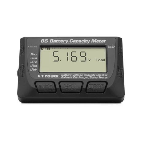 The LiPo battery tester 1-8S is a multifunctional measuring device for testing the battery life of most major model types: Li-Po, Li-ion, LiFe, LiHV, NiCd and NiMH. It also allows discharging with balancing and autonomous balancing of lithium sets to balance the voltages of individual cells to the same level. In servo mode, it can be used to test servos and electronic speed controllers.