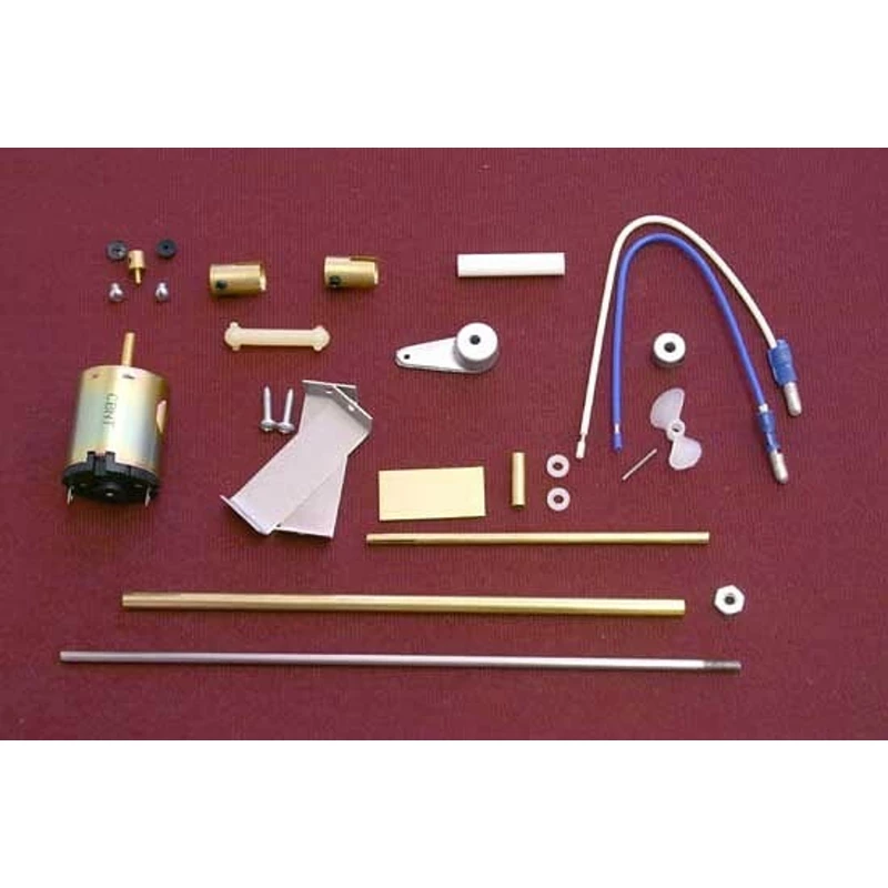 Drive set for Dumas USS Whitehall patrol boat. Includes: electric motor 380 / 4.8 V, shaft with housing, cardan. clutch, 2-blade propeller, rudder set, connecting material.