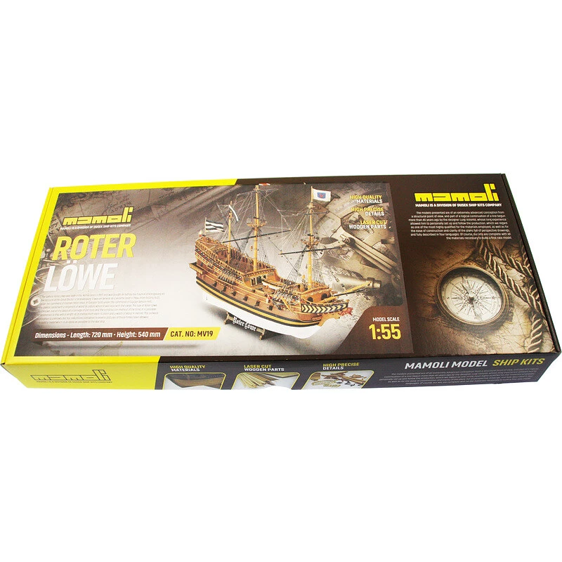 The kit of the non-floating historical model of the sailing ship MAMOLI Roter Löwe from 1597, is 1:55 scale and has a total length of 720mm. Galleon Roter Löwe was built in the Netherlands as a merchant ship and was purchased for the city council of Königsberg in Brandenburg in 1561. The package includes wooden parts, moldings and a number of fittings, rigging, plans, etc.
