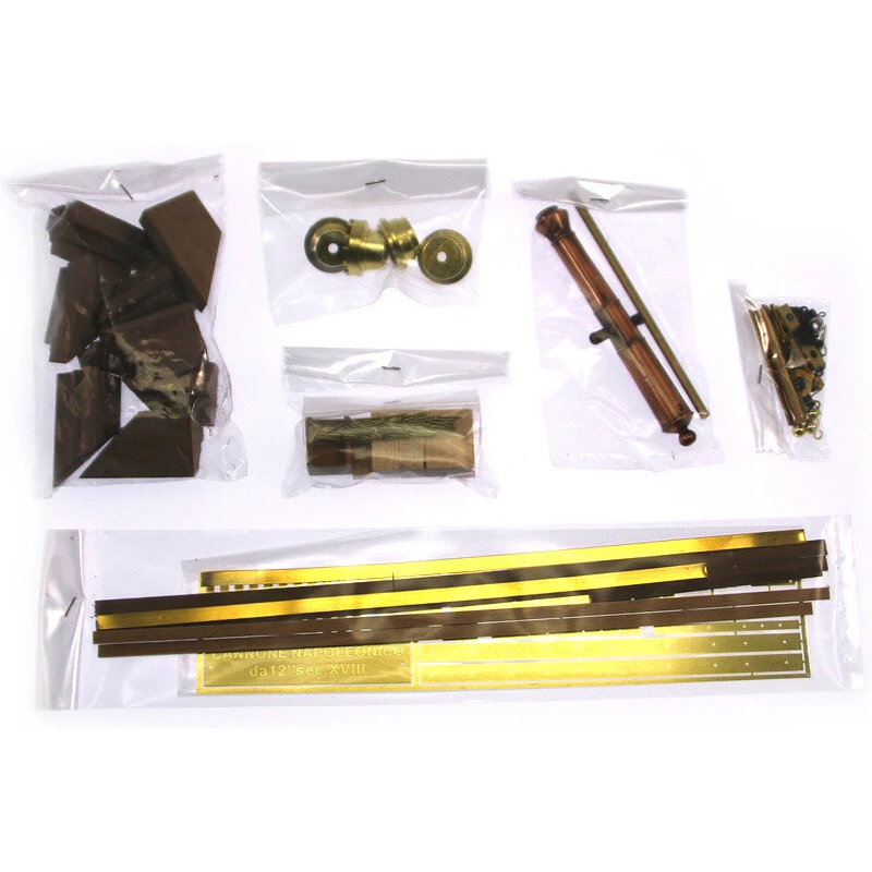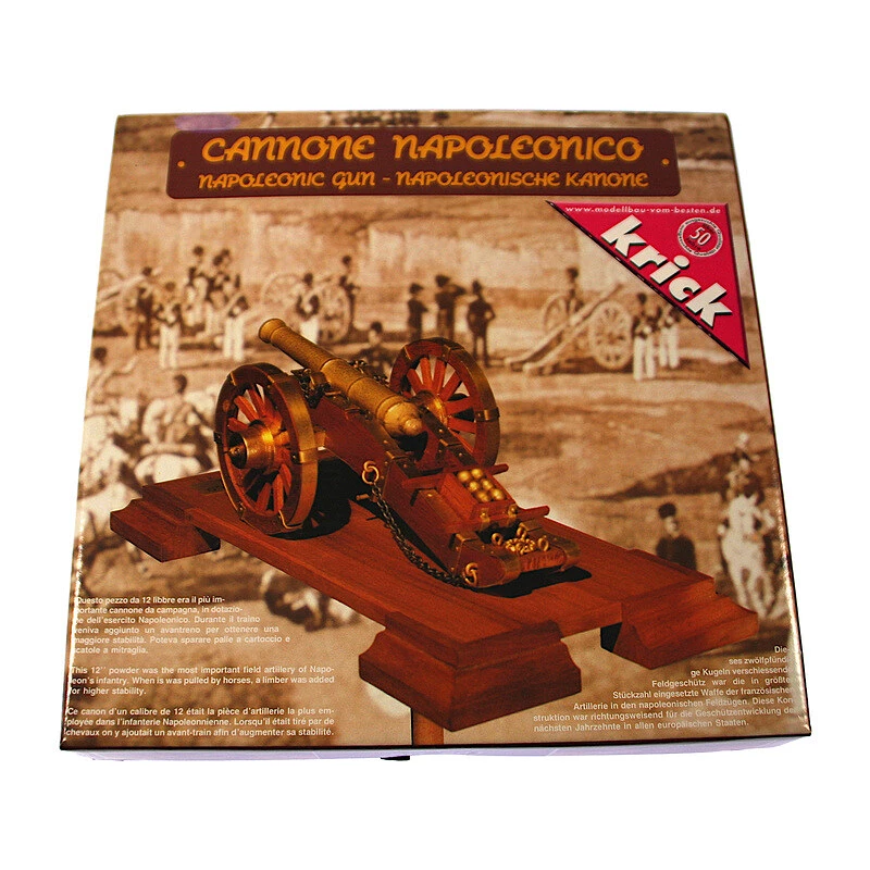 1:17 scale Napoleonic Cannon model kit, or 12 pounder field gun. One of the most important weapons of Napoleon's infantry, which later became the model for other field guns. It was possible to shoot from the cannon both cast cannonballs and artillery shells, shrapnel or brush cartridges. The range of the cannon was about 1.5 km, when shooting with brush cartridges up to 300 meters, moreover, relatively accurately. The cannon was relatively light, so it could be moved quickly on the battlefield using a horse-drawn carriage.