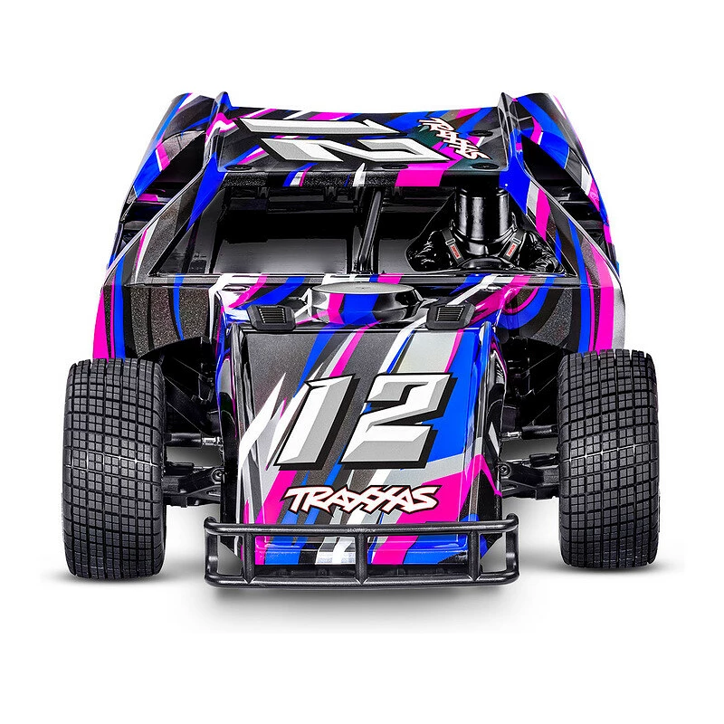 Traxxas Slash Mudboss oval special RC car model in 1:10 scale built on the proven Slash chassis with a 2WD drive and a speed of up to 56 km/h . It is powered by a powerful AC motor with a BL-2S regulator . The model is designed to provide competition performance, which is helped by installed upgrades such as an Extreme Heavy Duty kit, aluminum GTR shocks and a Magnum 272R transmission. A clipless body mounting system is used for easy battery replacement.