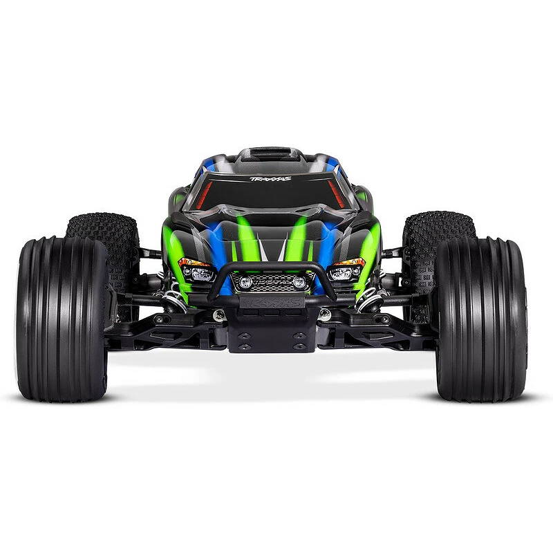 The Rustler rides on aggressive chrome 6-spoke 2.8" wheels. The unique Alias rubber compound provides high grip on a wide variety of surfaces including dirt, grass, concrete and rocks. The rear step-pin studded tires provide excellent off-road traction, while the grooved front tires it holds the driving track perfectly.