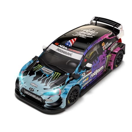 Oryginalny samochód wyścigowy SCX Hyundai i-20 WRC Block w skali 1:32, przeznaczony do torów analogowych SCX Original. Autko wyposażone jest w światła LED.