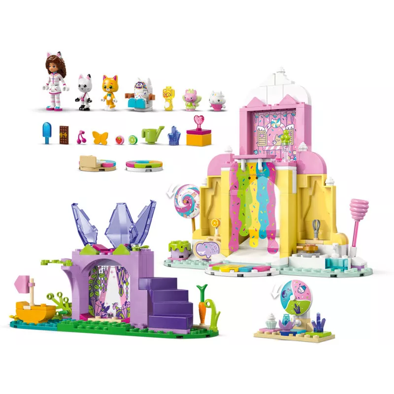 Ten kreatywny zestaw konstrukcyjny zawiera 2 lokacje filmowe i szereg figurek LEGO, w tym Gabi, Kota Pandy i Wróżkę Kocię. Dzieci przeniosą się do magicznego świata słodkości na Sugar Mountain. Figurki mogą zjeżdżać po kolorowym wodospadzie na pączkach. Ogród Koci to fantastyczne, przytulne miejsce, w którym Wróżka Kocię siedzi na swoim kryształowym, kwiatowym tronie, a dzieci znajdą tam mnóstwo niespodzianek. Dzięki kolorowym, ilustrowanym instrukcjom, dużemu klockowi startowemu i osobnym torebkom – każda torebka zawiera klocki do jednego modelu – dzieci mogą bez wahania rozpocząć swoją przygodę z budowaniem.