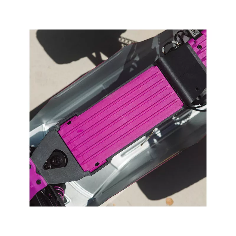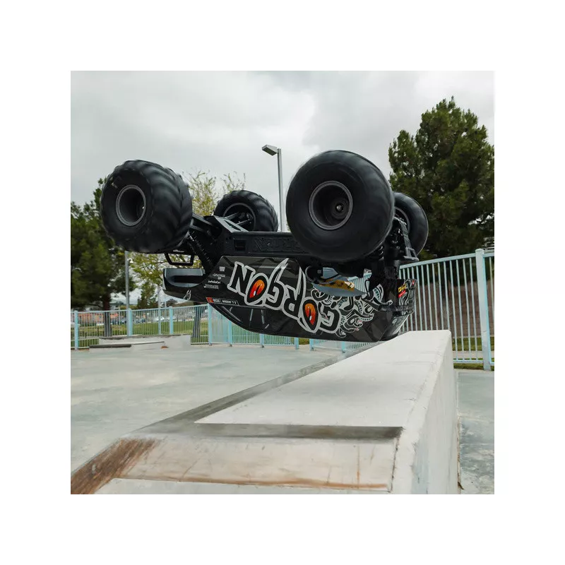Kompozytowe podwozie wykonane jest z wytrzymałością ARRMA. GORGON MT ma specjalnie skonstruowaną konstrukcję ze sztywnym, wąskim podwoziem, niezależnym zawieszeniem i olejowymi amortyzatorami, które płynnie amortyzują nierówności. Komora akumulatora na spodzie podwozia umożliwia wymianę akumulatora bez konieczności demontażu nadwozia.