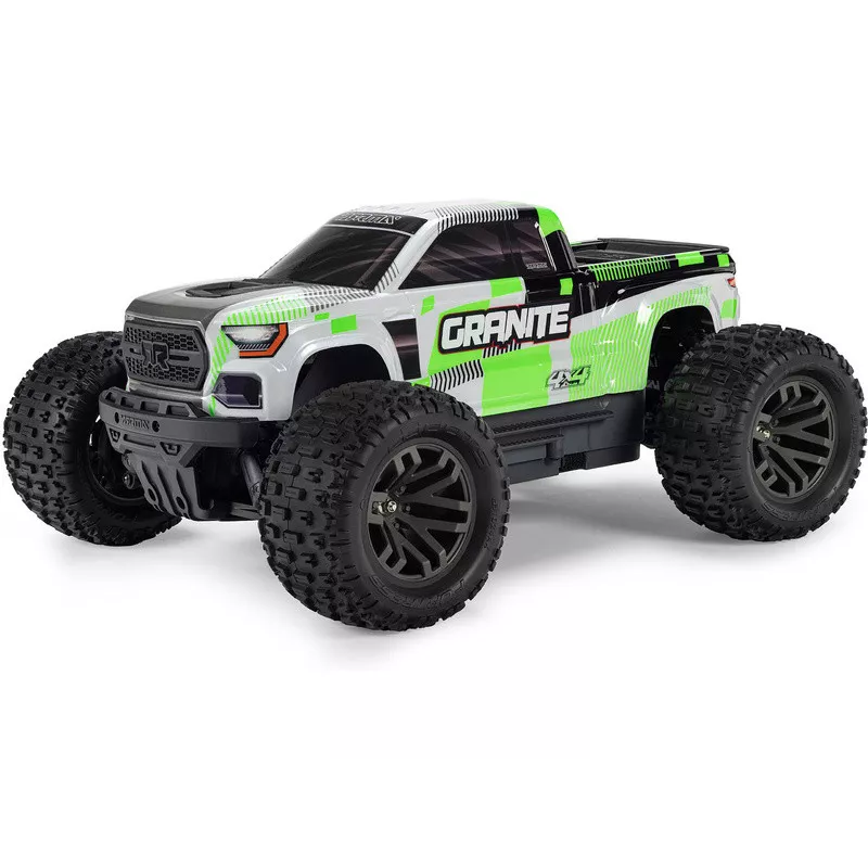 Model samochodu zdalnie sterowanego Arrma Granite Mega 4x4 w skali 1:10, idealny dla dzieci i początkujących, oferuje większy moment obrotowy od razu po wyjęciu z pudełka, dzięki większemu o 11% silnikowi prądu stałego 665 (High Torque) . Osiąga prędkość do 32 km/h. Trwała obudowa z przesuwanymi płytami i podniesionymi bokami, zapobiegającymi przedostawaniu się brudu. Solidne mechanizmy różnicowe z metalowymi zębatkami. Amortyzatory olejowe. Obudowa bez zatrzasków umożliwiająca łatwą wymianę baterii. Zestaw zdalnie sterowany Spektrum SLT2.