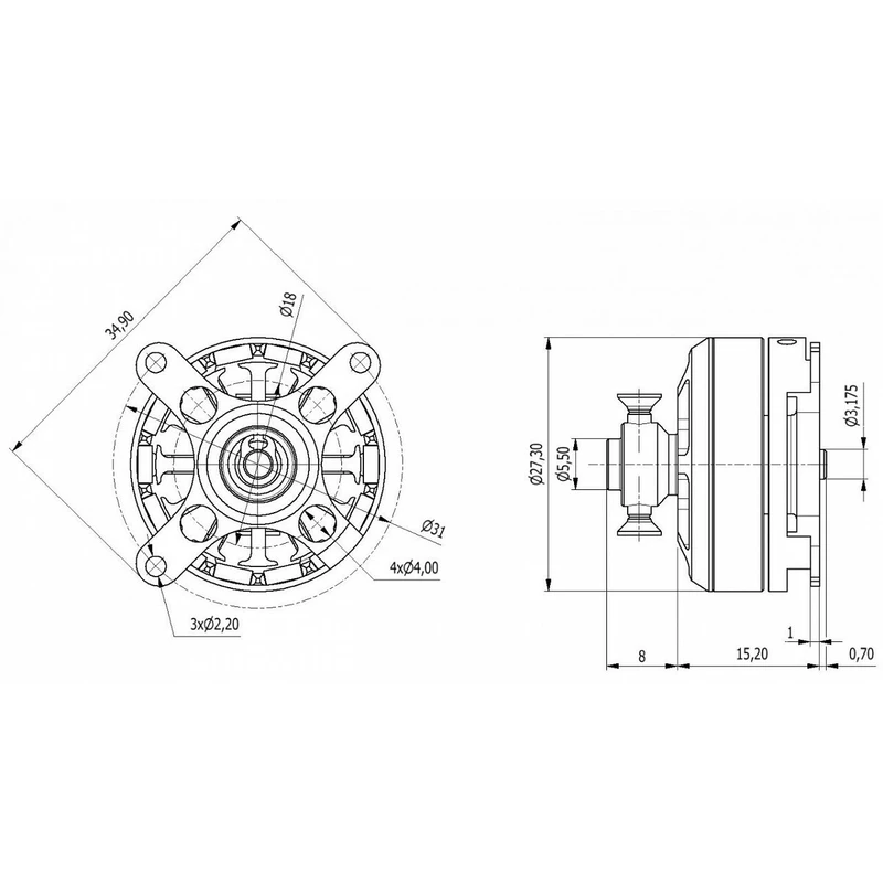 Mocowanie silnika: AXI 2203/52 V2 jest przeznaczony wyłącznie do montażu z tyłu z trójki stóp na przedniej ścianie, przewoźnik Prop nadaje się do śmigła GWS jest integralną częścią silnika. Odlewania nośnik dla śruby o średnicy 5,5 mm, przy czym silnik jest zasilany z dwóch adapterów o średnicy od ramienia 7 i 8 mm. gródź silnika powinno być 1-1,5 mm sklejki lotniczej.